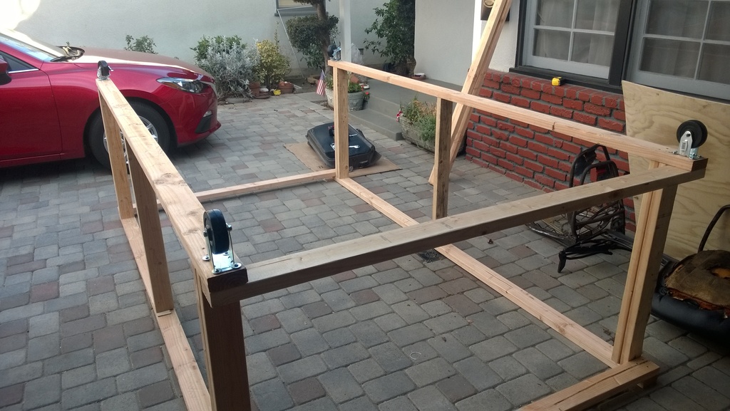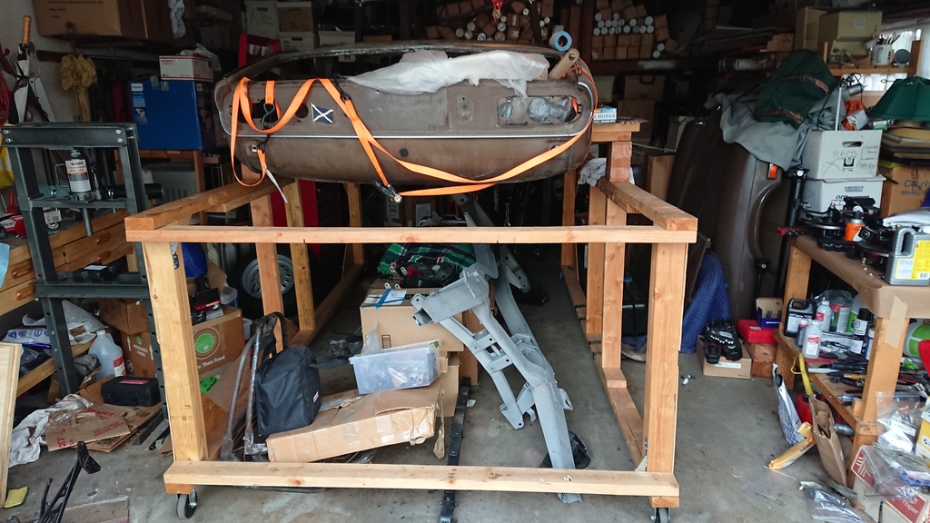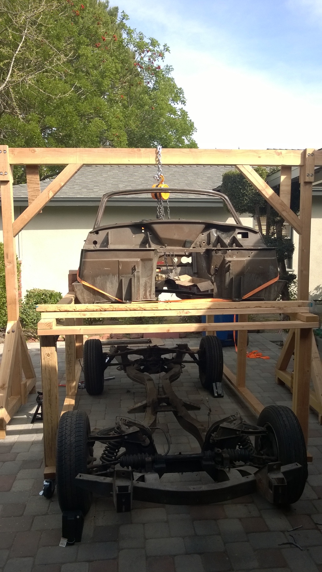 The car is a “body-on-frame” construction meaning that the shell of the car sits on top of a frame that holds the drivetrain. I built a large wooden frame on wheels designed to hold the shell above the frame, so that I could work on the two independently (and without damaging the shell).