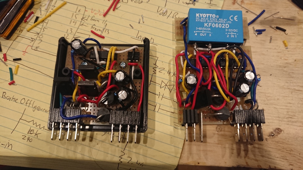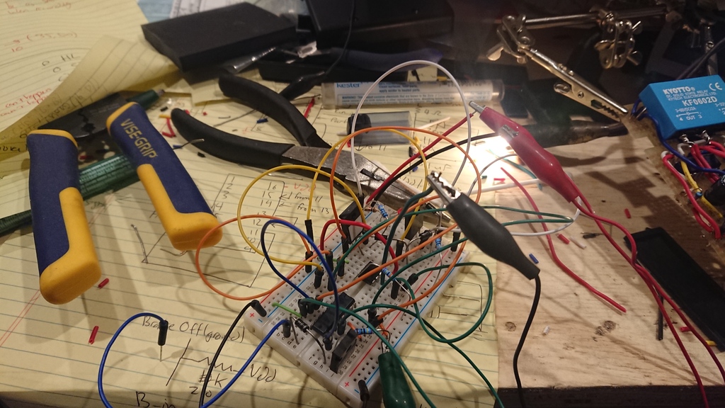 I wanted to have daytime-running-lights in the car, which are lights that are “always on” when the ignition is on, the handbrake is off, and the headlights are off. I created a simple circuit to compute this logic and tolerate the surge of current that can happen when the starter motor is first engaging.